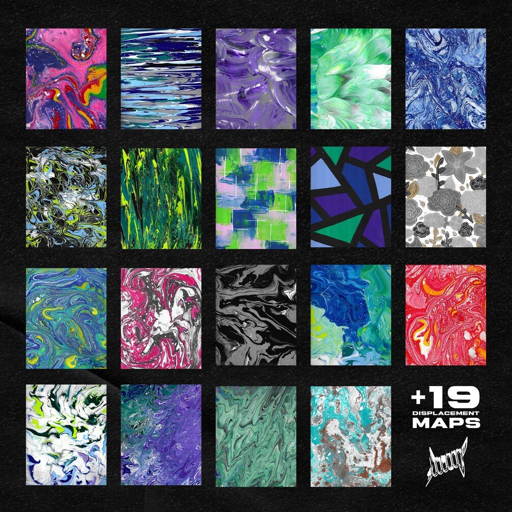 19 hand painted, one of one canvases scanned as high quality JPG images AND 19 displacement maps that are photoshop game changers!